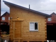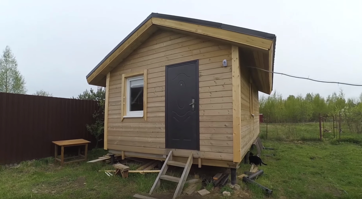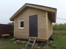 Shed-Dächer sollten auf Sparren im Abstand von 0,5 - 0,8 m abgestützt werden.Dachmaterial sollte mit Spezialschrauben, einschließlich synthetischer Gummihüte, am Boden befestigt werden. Diese Tops verhindern das Eindringen von Wasser. Wenn es kein spezielles Befestigungselement gibt, müssen Sie einfache Schrauben verwenden und diese mit externen Gummifüßen ergänzen. Dann werden die Giebel zugenäht, der Abfluss ist ausgestattet - auf diesem sind die Außenarbeiten am Rahmenbad abgeschlossen.