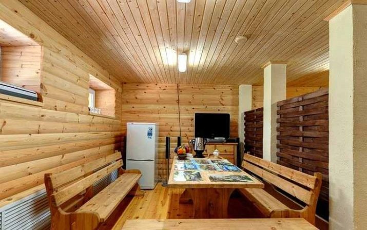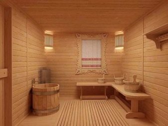 Die Dekoration des Rahmenbades von innen ist nicht weniger wichtig als die Außenseite. Es wird empfohlen, umweltfreundlichen Materialien den Vorzug zu geben, ihre erhöhten Kosten sind voll gerechtfertigt.Die Wahl des Designs im Innenraum ist jetzt nicht begrenzt, Sie können jeden Stil verwenden, nicht unbedingt traditionelles Russisch. Die Warteräume sind mit Hartholz und Nadelholz getrimmt. Aber die Farbe ist wünschenswert, um das ruhigste und ausgeglichenste angesichts des Zwecks des Bades zu wählen.