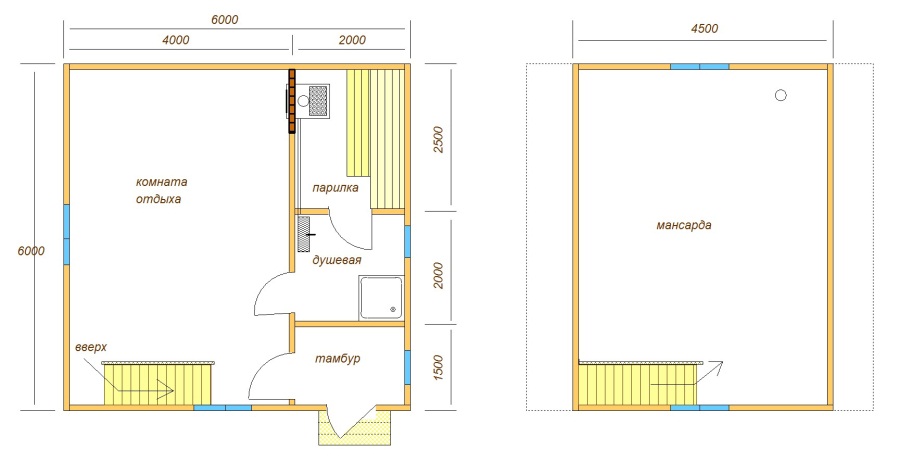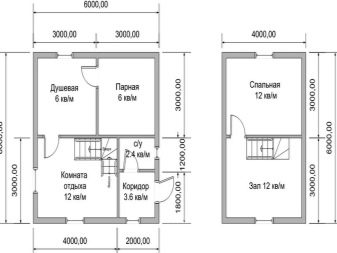 Auf einem größeren Grundstück ist es durchaus möglich, ein 6x6 großes Badehaus zu bauen: es ermöglicht nicht nur das Abwaschen von Schmutz, sondern auch das Einladen der ganzen Familie und sogar einer Gesellschaft von Freunden. Typische Projekte mit solchen Parteien implizieren eine bedeutende Fläche des Ruheraums - sie kann 20 m2 erreichen. Meistens befindet sich dort die Treppe, die den ersten Stock mit dem Dachboden verbindet.