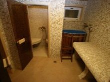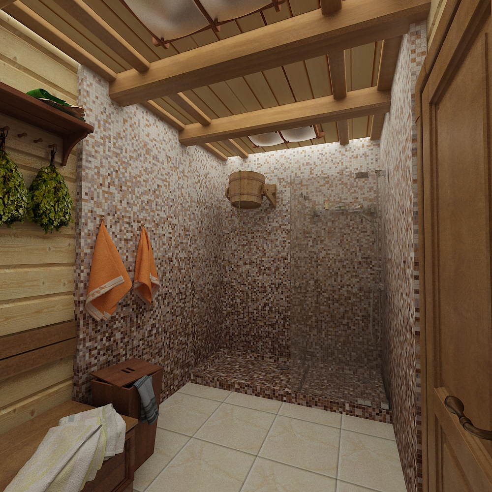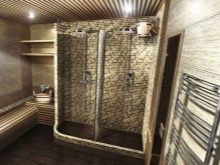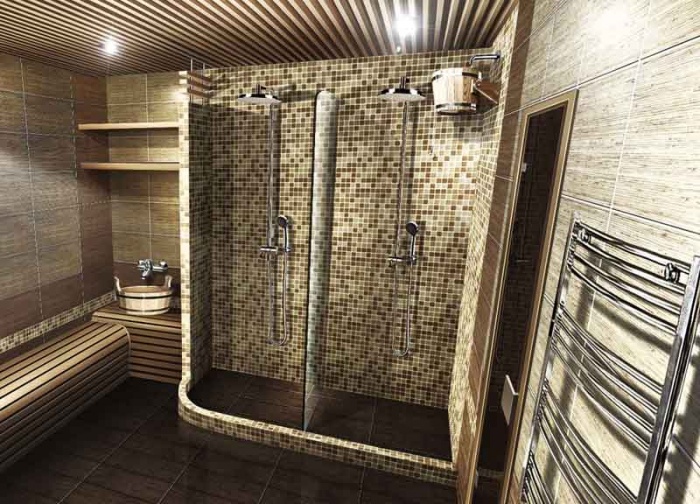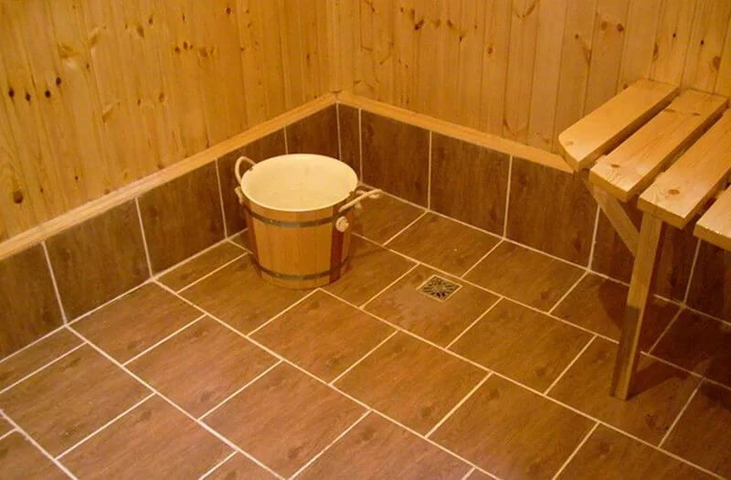 Der Boden im Dampfbad und die Dusche sind mit einer Neigung für den Wasserfluss gemacht. Auf dem Tiefgang lagen Bretter aus Lärche oder Eiche. Eine gute Option ist es, den Boden zu kacheln. Dieser Boden ist leicht sauber zu halten. Fliesenkleber mit Anti-Rutsch-Beschichtung. Und im Dampfbad arrangieren sie Matten aus einem Holzgitter, die nach jedem Gebrauch angehoben und getrocknet werden.