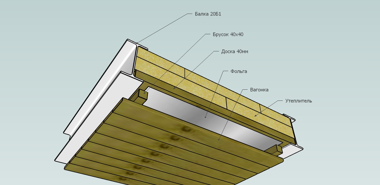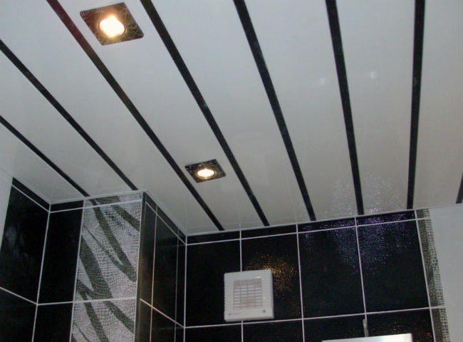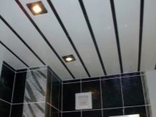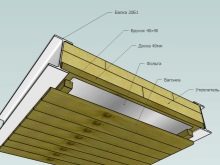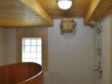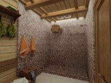 Die Decken im Dampfbad sind mit Naturholz ummantelt, im Waschraum mit Deckenpaneelen aus Kunststoff. Achten Sie darauf, eine Schicht Dampfsperre zu legen. Führen Sie die Kiste aus einer Stange oder einem Metallprofil aus. Um die Beleuchtung zu organisieren, wird die abgehängte Decke auf die Höhe der Basis der Beleuchtungskörper abgesenkt und die elektrische Verkabelung wird ebenfalls dort platziert.