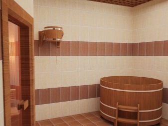 Die Wandfliesen werden nach den ästhetischen Vorlieben der Saunabesitzer ausgewählt. Die Hersteller bieten eine breite Palette von verschiedenen Dekors, es ist besser, eine Kombination von Fliesen aus einer Kollektion zu wählen, so dass die Nuancen der Farbpalette im selben Stil gehalten werden. Es ist vorzuziehen, Feinsteinzeug auf dem Boden zu verwenden.Es ist teurer, hat aber die Stärke und Haltbarkeit von Naturstein und ist aufgrund der Zusammensetzung der Polymere in der Beständigkeit gegenüber Feuchtigkeit und mechanischen Einwirkungen überlegen.