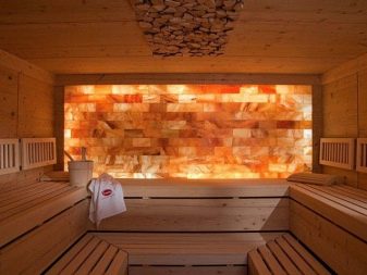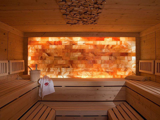 Pink, rot und schwarz Himalaya-Salz wurde sehr beliebt in der Dekoration der Sauna.. Salz ionisiert die Luft und macht ihre Zusammensetzung nahe am Meer, entfernt Schlacken aus dem Körper. Für die Veredelung werden Blöcke oder Fliesen aus Salz verwendet, sie haben eine geschichtete transluzente Struktur, während sie bei der Organisation der Beleuchtung leuchtende Wände schaffen, die in ihrer dekorativen Wirkung spektakulär sind.