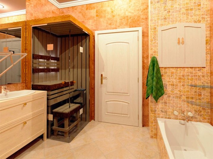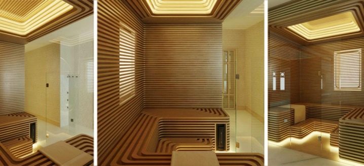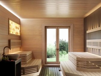 Für ein Dampfbad ohne natürliches Licht ist es besser, die hellen Farben von natürlichem Holz zu verwenden.