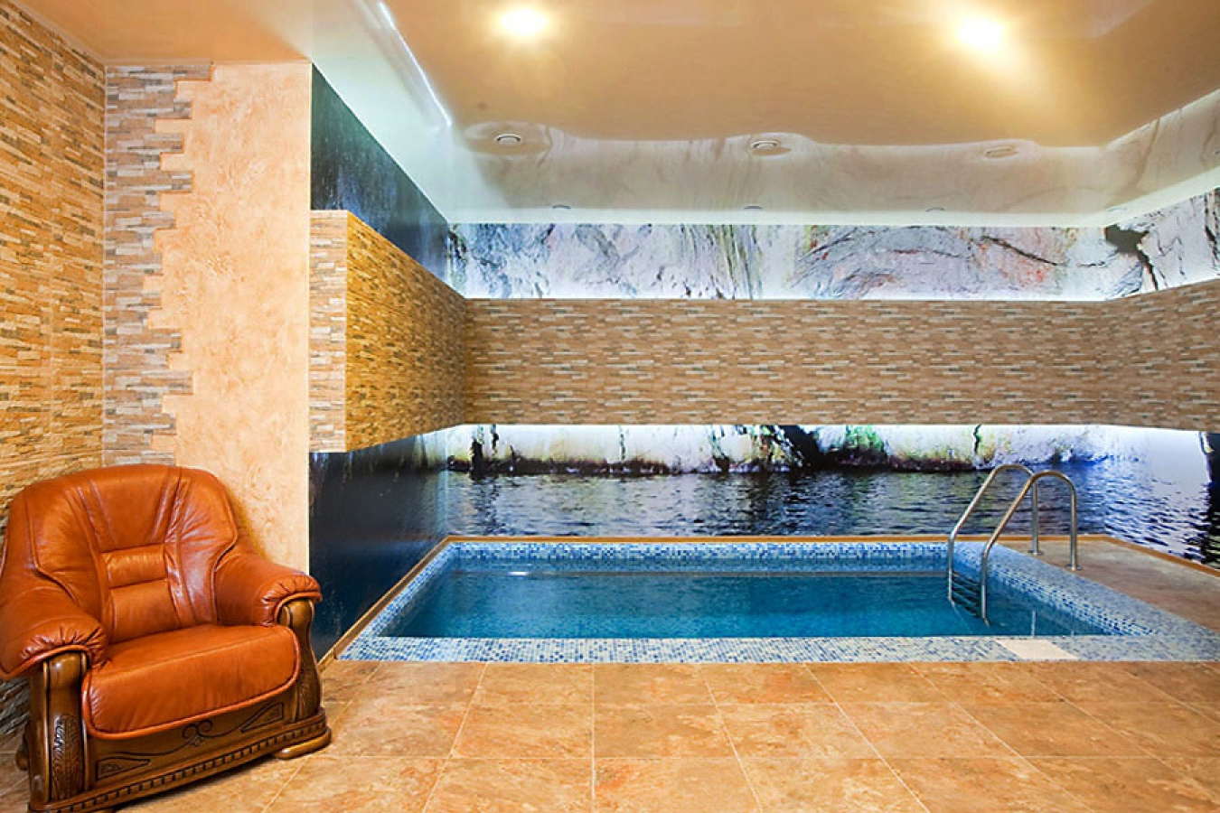 Der Ruheraum hat die übliche Umgebung, die dem Wohnzimmer entspricht, so dass Sie hier jede Art von Dekoration verwenden können - von der Tapete bis zum Naturholz oder um die Wände zu streichen. Eine Ausnahme ist die Kombination eines Ruheraums mit einer Dusche und einem Schwimmbecken, wobei in diesem Fall feuchtigkeitsresistente Materialien im Vordergrund stehen.