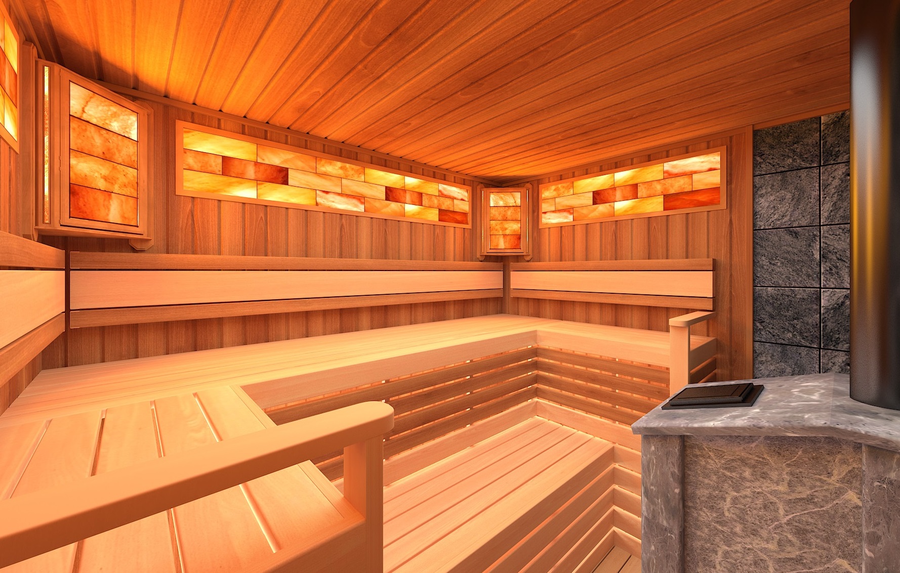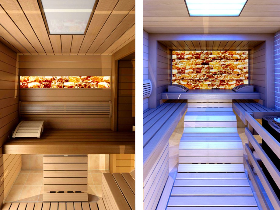 LED-Beleuchtung und Einsätze aus Himalaya-Salz mit Beleuchtung von innen verleihen einem einfachen Dampfbad Innenraum Raffinesse.
