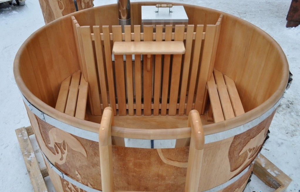 Sauna Furaco Es ist eine hölzerne Schrift, in zwei Hälften geteilt, eine mit Wasser gefüllt und mit Sitzen ausgestattet, die zweite Hälfte des Fasses ist mit einem eingebauten Ofen ausgestattet, der das Wasser auf 45 Grad erhitzt.