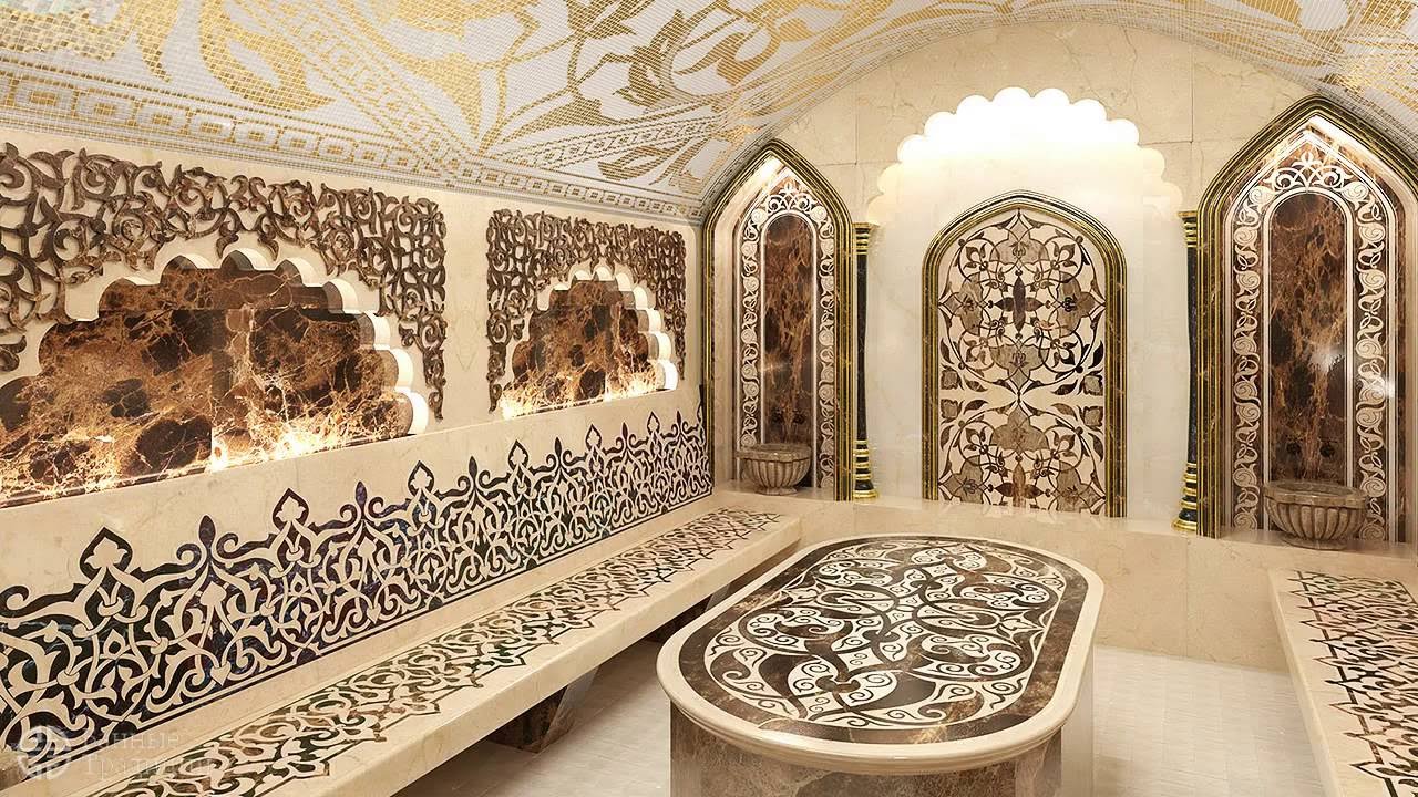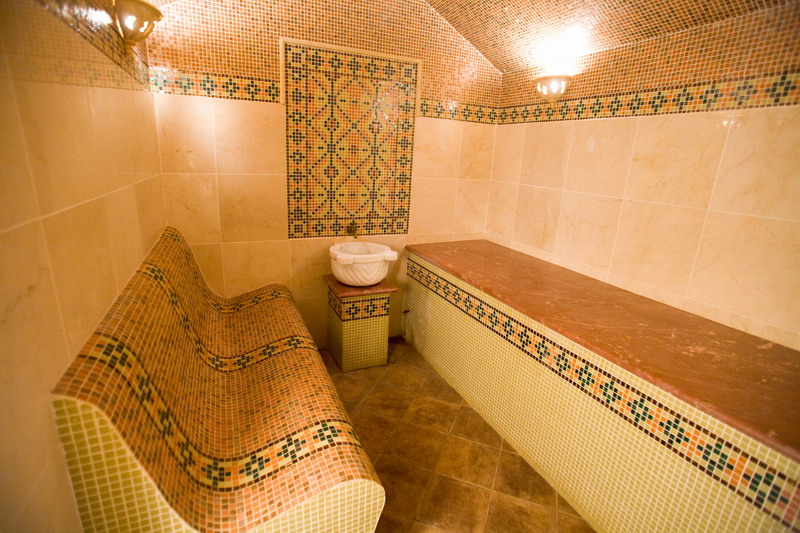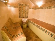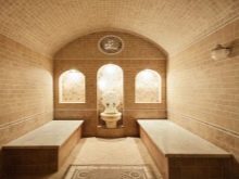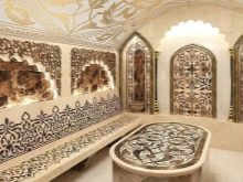 - Türkischer Hamam - Die Luftfeuchtigkeit ist höher als im russischen Bad und die Temperatur übersteigt nicht 40 Grad. Somit werden auch für Menschen, die keine extreme Hitze vertragen, optimale Bedingungen geschaffen. Der Bau der türkischen Sauna erfordert neben dem Dampf auch die Verfügbarkeit von Räumlichkeiten für verschiedene Anwendungen - Massage, Wickel und andere. Anstelle von Holz werden Keramikfliesen und Mosaike mit orientalischen Ornamenten als Dekoration verwendet.