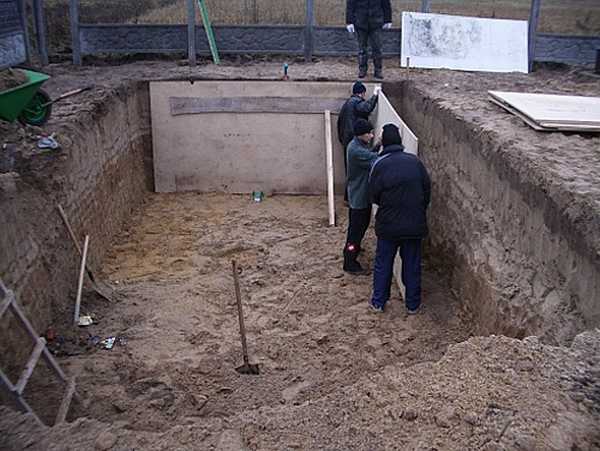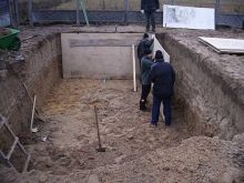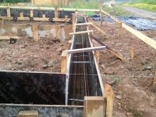 Die Arbeit beginnt mit der Vorbereitung von Gruben, von denen eine für das Fundament bestimmt ist, die zweite - unter der Klärgrube. Als nächstes legen Sie das Fundament. Die einfachste Version ist säulenförmig. Wenn eine groß angelegte Konstruktion geplant ist, ist es besser, einen Monolith oder einen Band zu wählen.. Bei einem Streifenfundament wird sofort ein Abwassersystem durchgeführt. Polypropylenrohre werden auf einem Sandkissen platziert, das mit der Regenrinne verbunden ist.