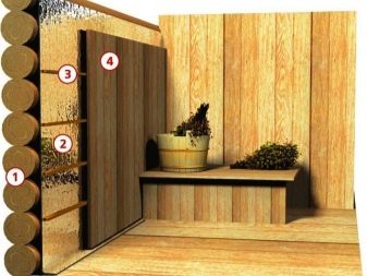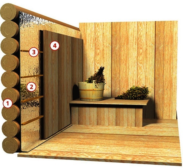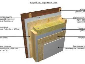 Wenn der Rahmen außen mit Brettern ausgekleidet ist, sind auf der Innenseite mehrere Schichten angebracht, die für eine normale Wärmeeinsparung sorgen.