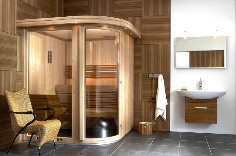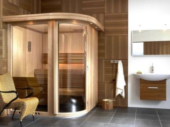 Die sparsamste und kompakteste Variante ist eine Mini-Sauna, ein kleiner Schrank, in dem Sie alleine oder zusammen baden können. Ein solches Design ist für kleine Stadtwohnungen relevant, es wird oft im Badezimmer oder Schlafzimmer installiert. Für diejenigen, die Komfort über alles andere stellen, ist eine Familiensauna besser geeignet. Bei der Gestaltung wird berücksichtigt, dass eine Bank im Inneren platziert ist, auf der eine Person liegen kann. Der allgemein akzeptierte Standard ist in diesem Fall eine Wandlänge von mindestens 1,8 Metern.