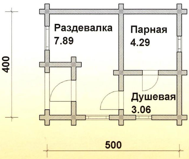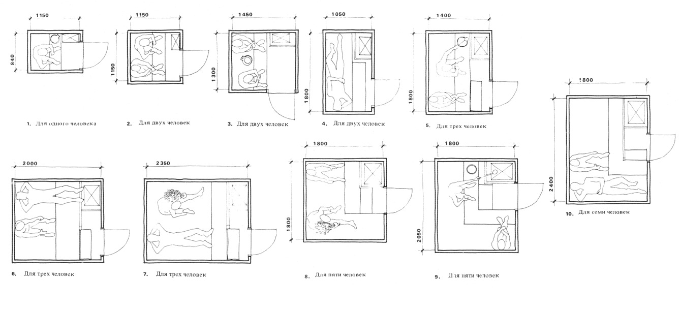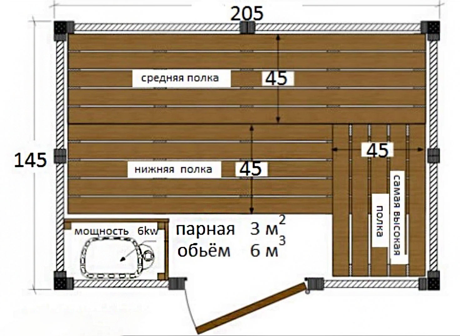 Gemäß den Vorschriften sollte jede Person mindestens 2,5 m³ haben. Empfohlenes Dampfbad sollte nicht mehr als 40 m³ sein. Wenn es sich um ein separates Gebäude und nicht um einen ausgestatteten Raum in einer Wohnung handelt, wird zusätzlich zu dem Raum, in dem sie aufsteigen, ein Waschraum und eine Umkleidekabine eingerichtet. In diesem Fall beträgt die Fläche einer kleinen Sauna pro Person mindestens 10 m².