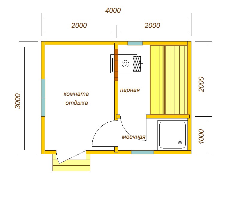 Badgröße von 3 bis 4 Quadrat. m - das ist zumindest ein kleiner, aber sehr gemütlicher Ort zum Entspannen. Es ist möglich, alle notwendigen Räume einzurichten: vom Dampfbad bis zum Ankleideraum. So können sich die Besitzer von kleinen Grundstücken keine Sorgen machen, denn selbst auf einem kompakten Hof können sie den perfekten Ort zum Entspannen bauen.