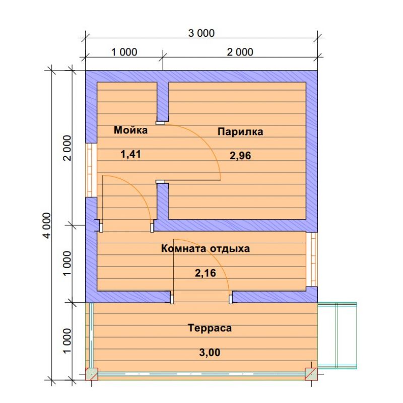 - Einfache Zwei-Zimmer-Option. Um Platz zu sparen, können Sie ein normales Bad wählen, das aus zwei Räumen besteht - einem Dampfbad und einem Ankleidezimmer. Der Plan eines solchen Gebäudes ist sehr einfach. Der Raum des Bades ist in zwei Haupträume unterteilt: ein Dampfbad und ein Ankleidezimmer. In der Garderobe gibt es einen Aufbewahrungsort für Dinge. Bei Bedarf können Sie auch einen Tisch mit Stühlen zur Entspannung in der kalten Jahreszeit arrangieren. Am Ausgang des Bades ist eine Terrasse zu bauen, wo Sie im Sommer die Stühle herausnehmen können. Wie für das Dampfbad, ist es bequem durch eine Trennwand in ein Dampfbad und eine Spüle unterteilt. In dieser Situation gibt es im Bad einen Platz für alles, was Sie brauchen und es wird keine unnötigen Teile geben.