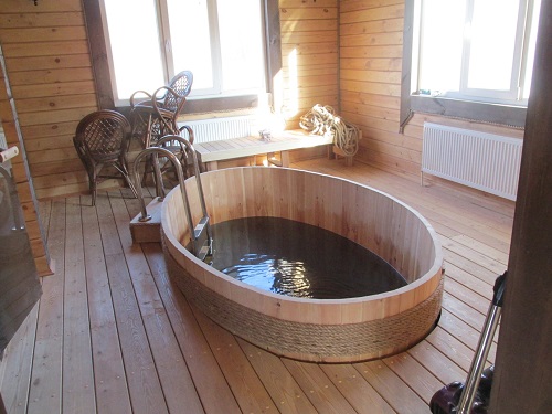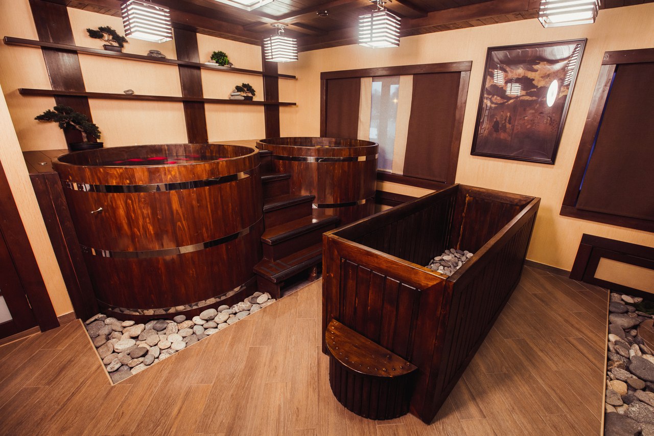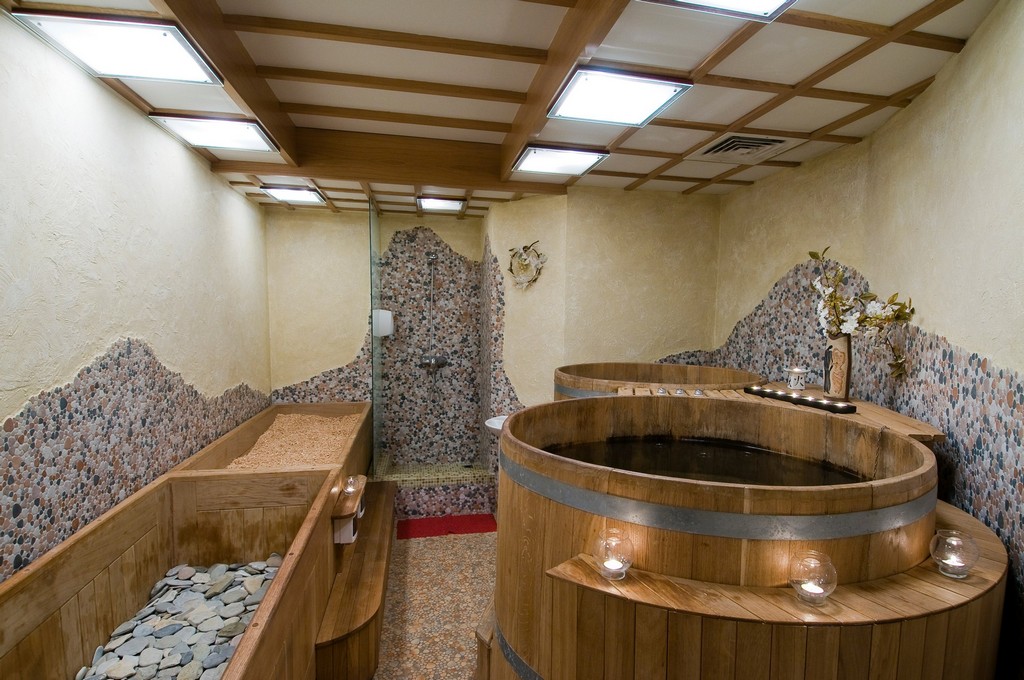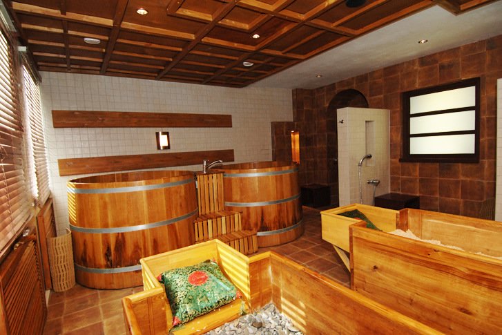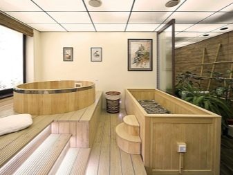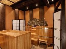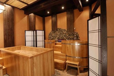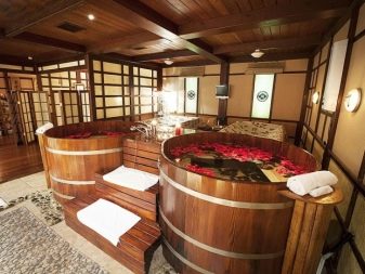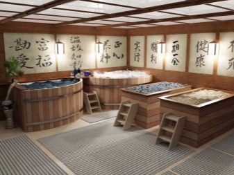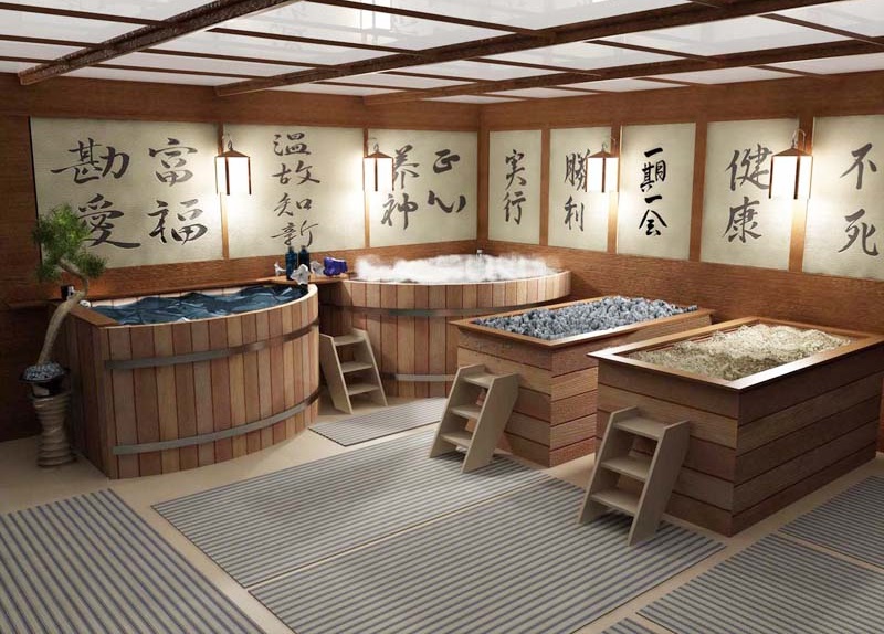 Das japanische Bad ist ein geräumiger Raum mit überwiegend hölzernen Gegenständen und Beschichtungen. Die Hauptbadeutensilien sind ein großes Fass mit Wasser (Furaco), rechteckige Schriften (Ofuro) mit Sägemehl oder Steinen, Massageliegen.
