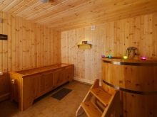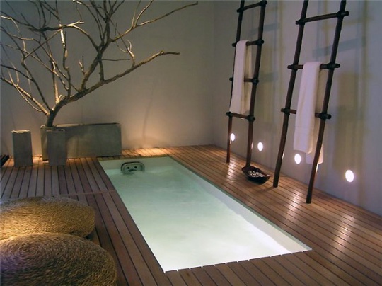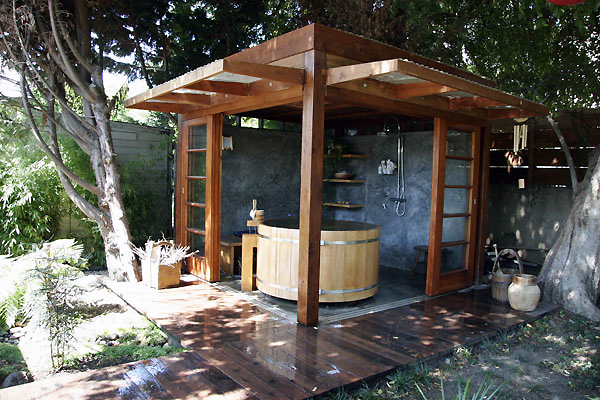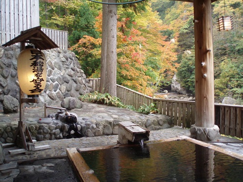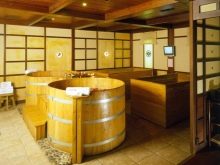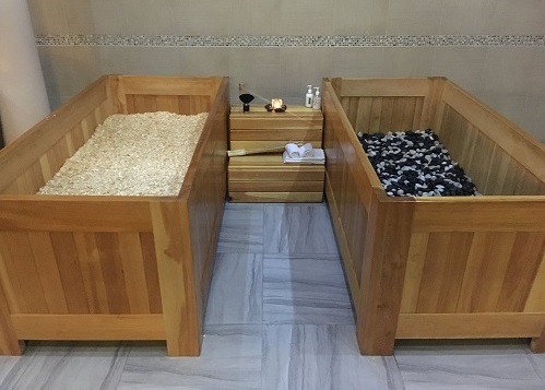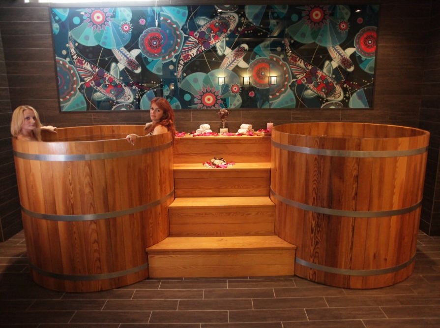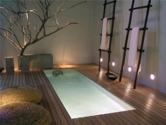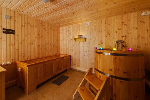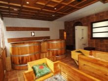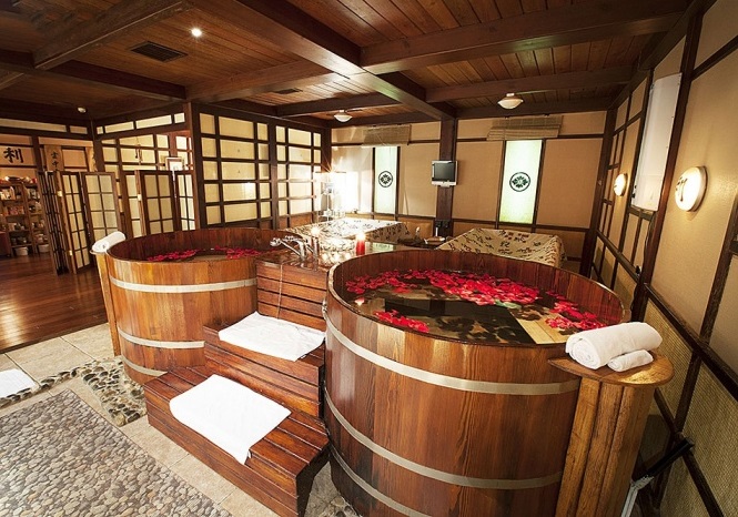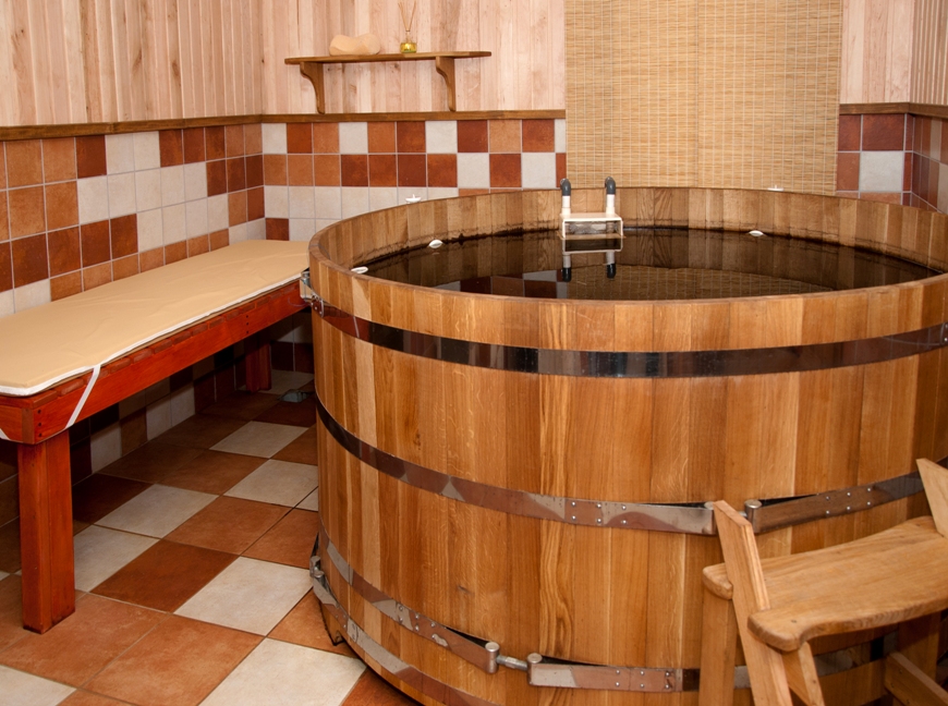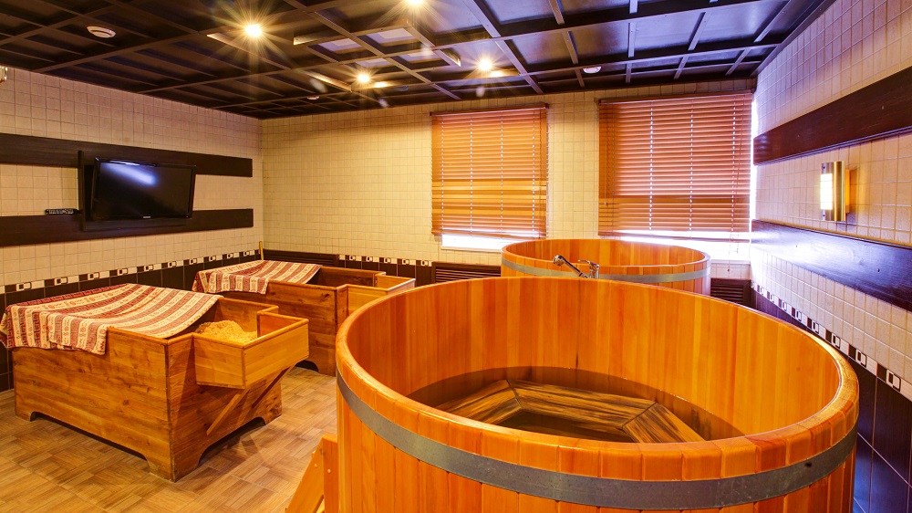 Das japanische Bad ist ein geräumiger Raum mit überwiegend hölzernen Gegenständen und Beschichtungen. Die Hauptbadeutensilien sind ein großes Fass mit Wasser (Furaco), rechteckige Schriften (Ofuro) mit Sägemehl oder Steinen, Massageliegen.