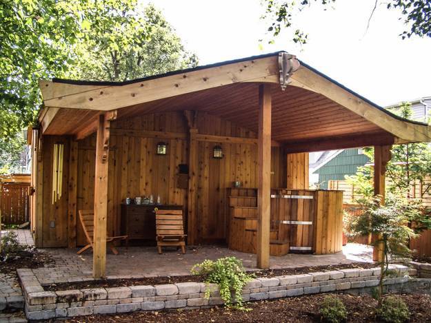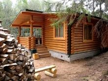 Für den Bau von Wänden und Dachstuhlsystem aus hochwertigem Holz, mit Antiseptika behandelt. Es ist erwähnenswert, dass die traditionellen japanischen Bäder aus Zedernholz und Eichenholz gebaut sind, das 300-500 Jahre alt ist. Unter unseren Bedingungen ist dieser Luxus jedoch möglicherweise nicht für jeden erschwinglich. Edles Eichenholz kann durch ein Holz oder einen verzinkten Stamm aus Kiefer oder Lärche ersetzt werden. Hauptsache, das Material war ohne Fäule und Wurmlöcher.