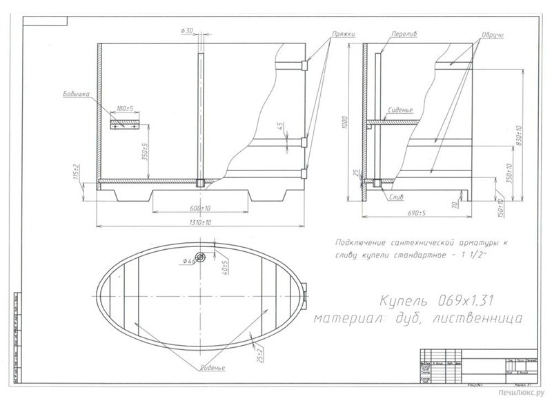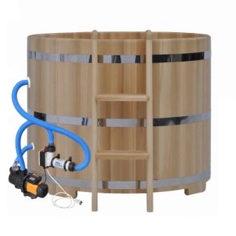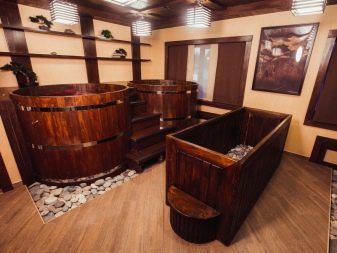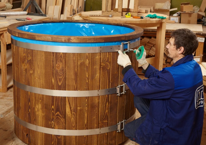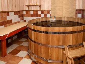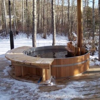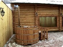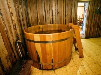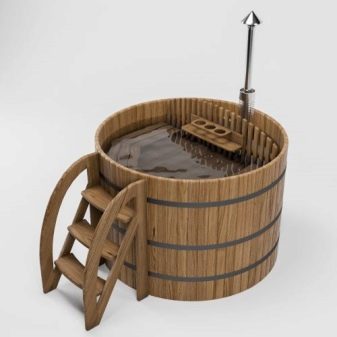 Die Höhe des Fasses variiert von 80 bis 130 cm, das Wasser darin erwärmt sich auf 45 Grad. Die runde Schrift ist außen mit bequemen Stufen zum Heben und innen mit Bänken am Umfang des Fasses ausgestattet. Das Heizsystem ist ein Ofen, der sich unter dem Boden oder der Seite der Innenseite des Fasses befindet. In der Variante der Innenheizung ist der Ofen durch ein Holzgitter von den Bänken getrennt.