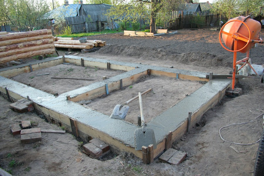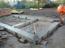 Der Bau sollte mit der Grundlegung beginnen.Übrigens ist es notwendig, auch wenn das Furaco-Fass unter freiem Himmel installiert wird. Holzbehälter mit Wasser, die mehrere Personen beherbergen, wiegen sehr viel, und deshalb müssen Sie eine stabile Basis für sie bilden. Die Grundlage für ein Bad kann Band oder Stapel sein. Im Falle der Auswahl einer Bandbasis für das gesamte Gebäude sollte ein separates monolithisches Fundament über den Aufstellungsort des Wasserfasses gegossen werden. Dazu wird an der gewählten Stelle ein Loch herausgezogen, ein "Kissen" aus Sand und Kies gelegt, mit einem Metallrahmen verstärkt und mit Beton gefüllt.