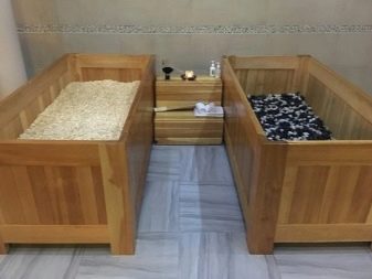 Das zweite Element des japanischen Bades ist eine rechteckige Holzkiste Ofuro, gefüllt mit heißem Sägemehl, seltener - Flusskiesel. Nach Beendigung der Wasserprozeduren und wenn nötig, ruht der menschliche Körper bis zum Hals in heißem Sägemehl.