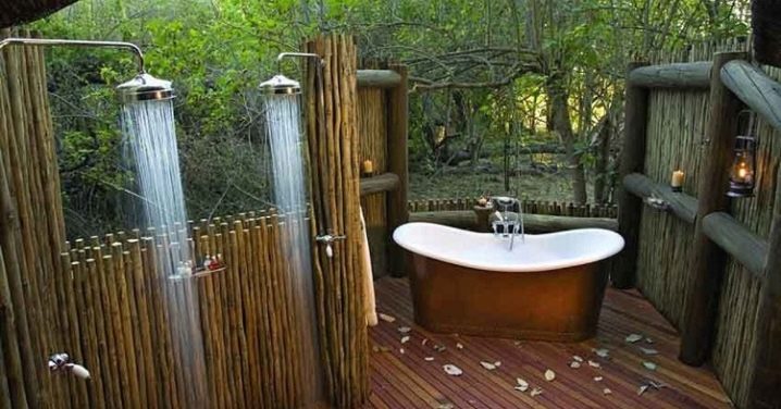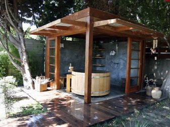 Die Schrift kann ein dekoriertes altes Bad sein, an dessen Boden ein Edelstahlofen installiert ist. Eine rechteckige Box für Ofuro und eine Sommerdusche können direkt auf der Straße in einer offenen Fläche oder Terrasse installiert werden.