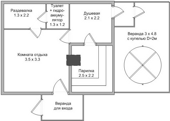 Die notwendige Struktur des zukünftigen Badkomplexes ist auch in der Entwurfswannenstruktur enthalten. Je nach Vorliebe kann das Bad einen Waschraum mit Duschkabine, einen Warteraum (Umkleideraum), einen Ruheraum für Teepartys und das Zusammensein mit Gästen, eine Veranda vorschlagen.