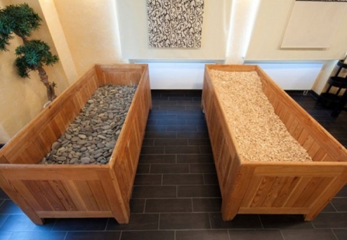 Eine andere Badekiste Ofuro ist normalerweise mit Flusskieseln gefüllt. Das Heizsystem und die Abmessungen der Schriftart wiederholen die vorherige Version vollständig. Ein Mann legt den Rücken auf erhitzte Steine und dehnt die Wirbelsäule so weit wie möglich.