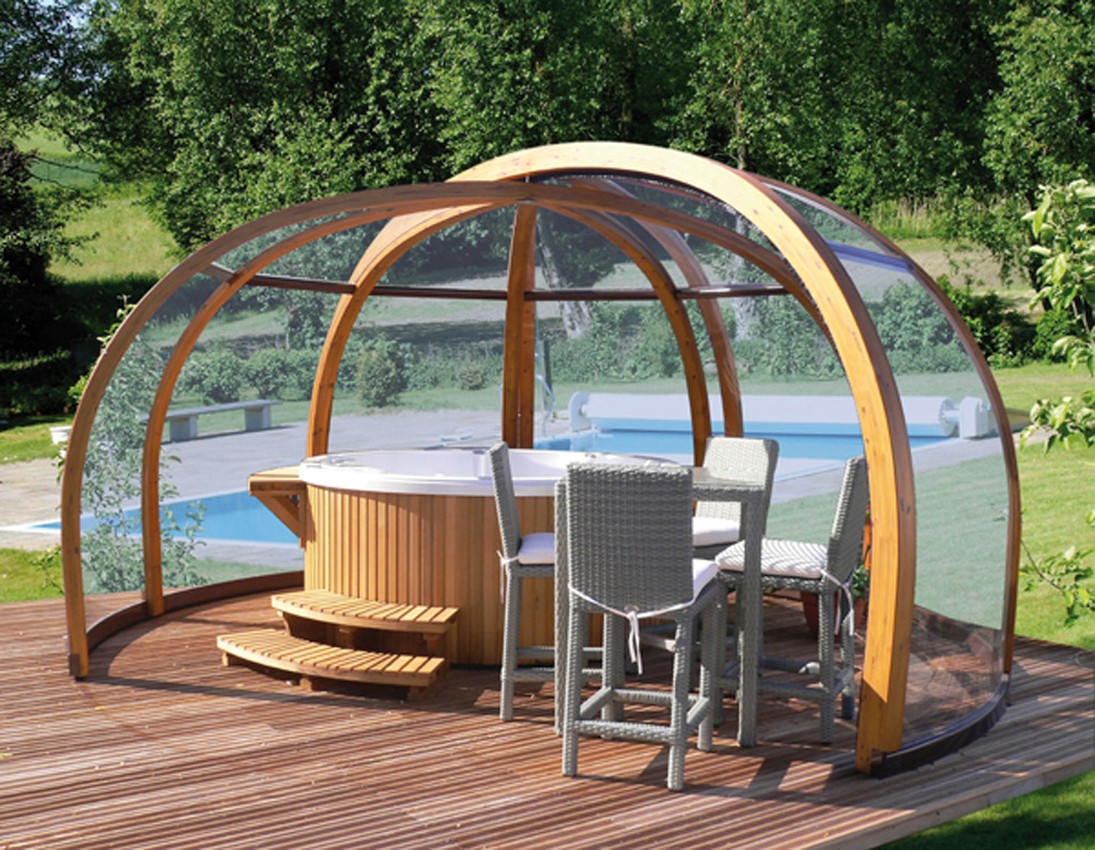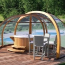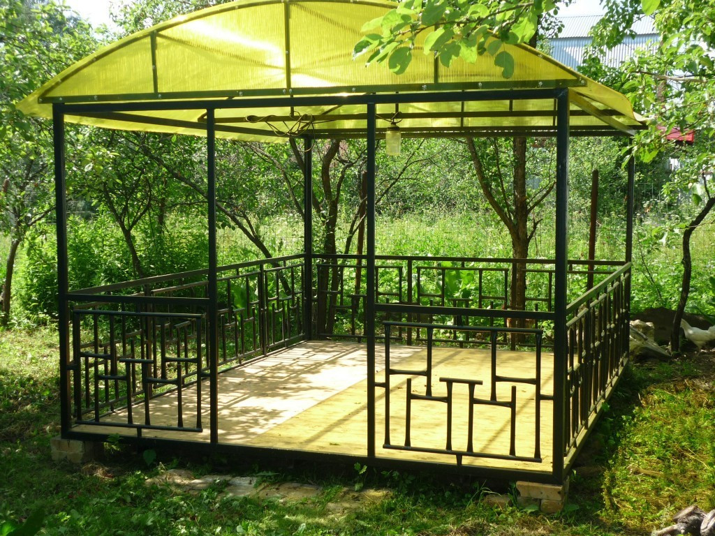 Moderne Materialien bieten auch viel Spielraum für Fantasie. Zum Beispiel können Polycarbonat-Pavillons aus jeder Form hergestellt werden - dieses Material biegt sich gut. Kugelförmige, halbkreisförmige, komplexe Formen - was ist genug Fantasie. Eine breite Palette von Farben und eine gute Fähigkeit, Licht zu übertragen, machen dieses Material zu einem echten Fund, und niedrige Kosten fügen ein weiteres Element zu seiner Liste von Verdiensten hinzu.