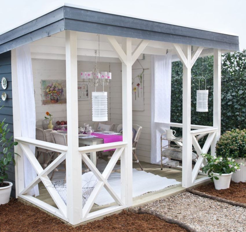 Sie können ein einfaches Metall- oder Holzdach installieren, und an die Stelle der Wände hängen weiße Lichtvorhänge, die Sie entweder zusammenbauen können - und den Innenraum öffnen oder auflösen - und Sie werden einen abgelegenen Ort bekommen.