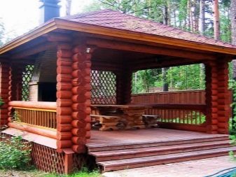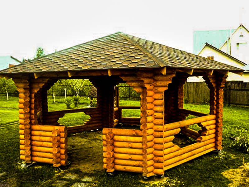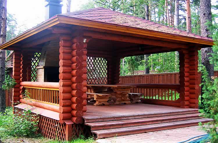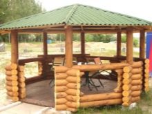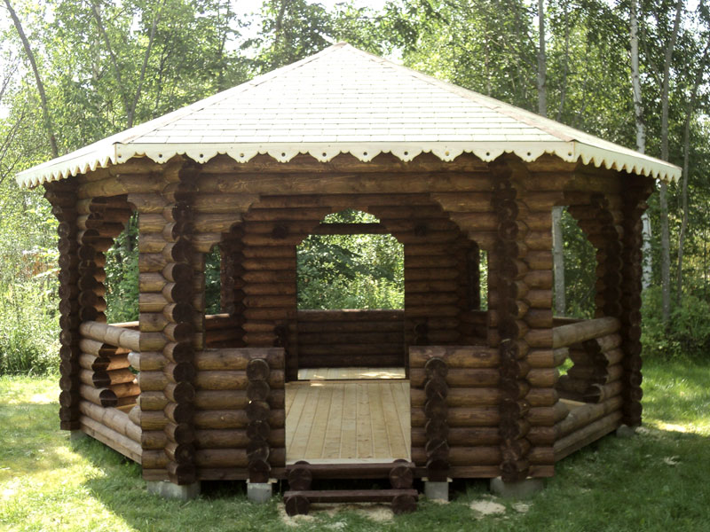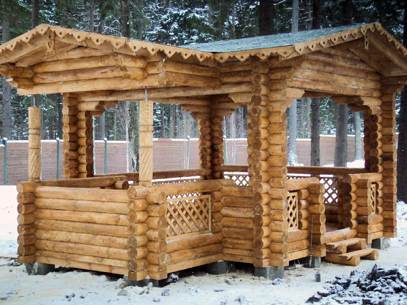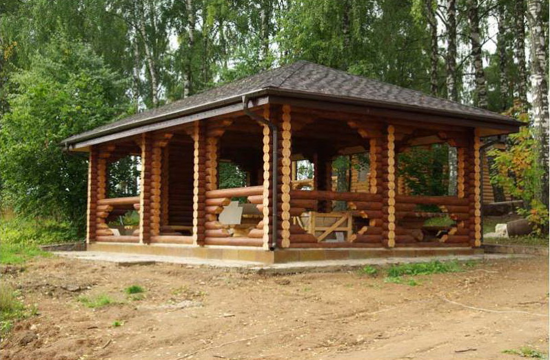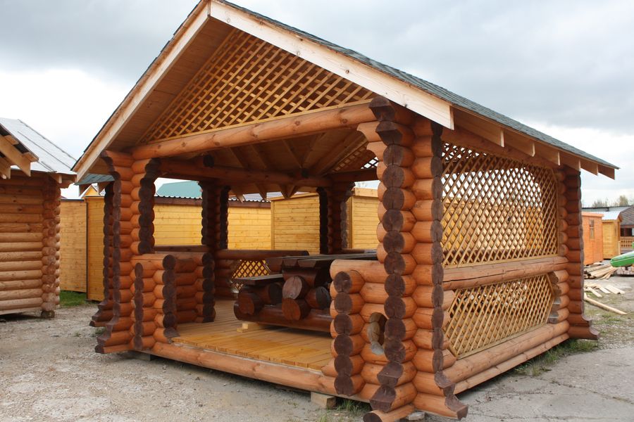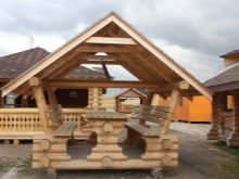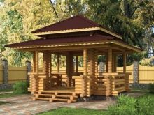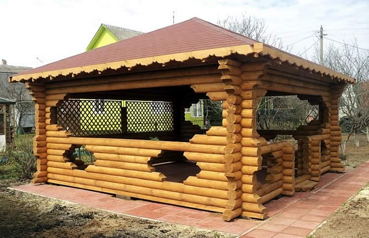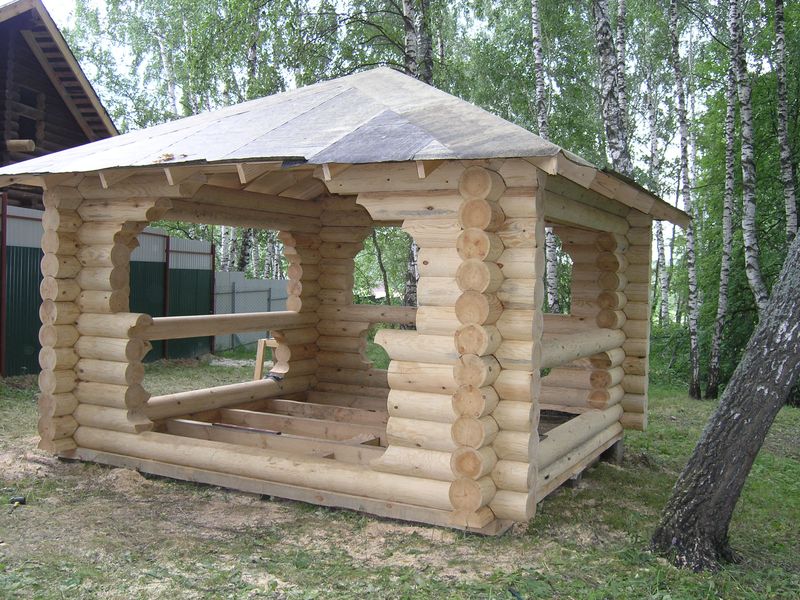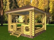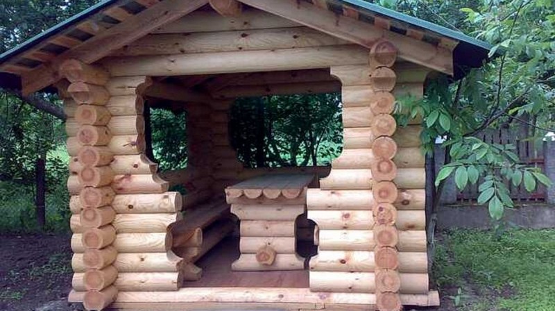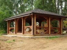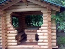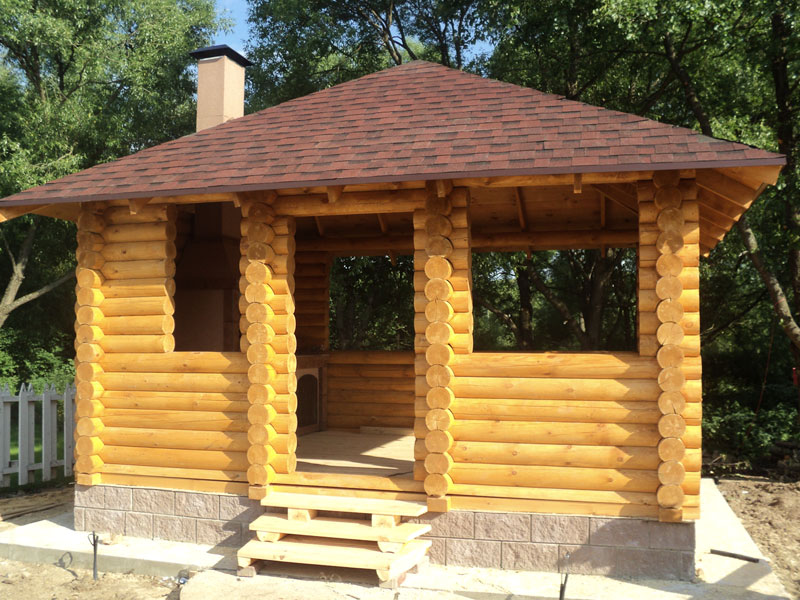 Es ist jedoch am besten, solche Gebäude aus einem Rundstamm zu bauen. Schließlich hat dieser Baumaterial eine ausgezeichnete Festigkeit und Haltbarkeit und verleiht dem Pavillon ein dekoratives Aussehen.