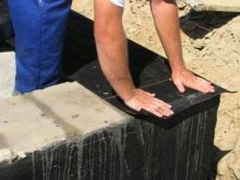Bevor Sie mit dem Legen der Stämme beginnen, müssen Sie mehrere Schichten Dachpappe auf die Fundamentfläche legen. Es spielt die Rolle der Abdichtung und schützt Holzscheite vor den schädlichen Auswirkungen von Feuchtigkeit.