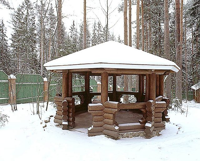 In der Regel wird ein solches Baumaterial wie Rundholz aus Kiefern-, Lärchen- oder Fichtenholz hergestellt. Es sollte jedoch beachtet werden, dass Für den Bau von Lauben empfiehlt es sich, Stämme aus Lärchenholz zu verwenden, da diese Nadelbaumart am zuverlässigsten, stark und haltbar ist. Stämme aus Lärche unterliegen praktisch keinen Verrottungsprozessen, was bei der Wahl des Materials für den Pavillon eine wichtige Rolle spielt. Schließlich ist ein Pavillon ein Gebäude, das zur Erholung genutzt wird und sich auf der Straße befindet.Allerdings sind die Kosten für einen Baumstamm aus Lärche höher als der Preis der gleichen Stämme von anderen Nadelbäumen.