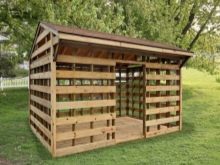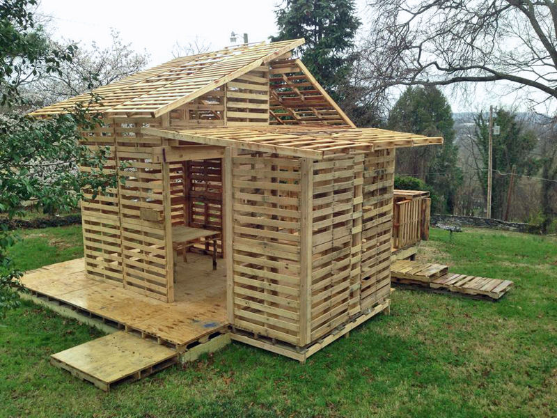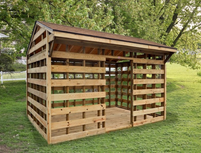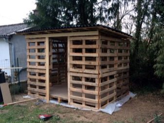 - Die Paletten sind in zwei Reihen so montiert, dass die zweite Reihe kein Licht durchlässt, das durch die Schlitze der ersten Schicht hindurchgeht. Bei dieser Methode sind die Wände der drei Seiten taub und nur der vordere Teil des Gebäudes bleibt offen. Diese Option ist für diejenigen geeignet, die Schatten und Dunkelheit lieben.