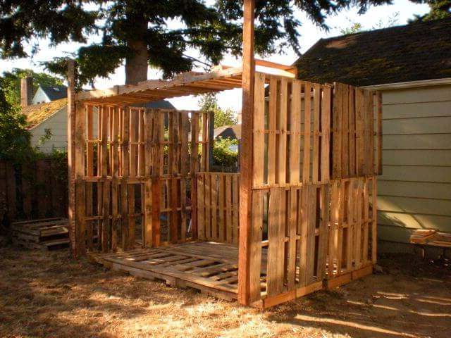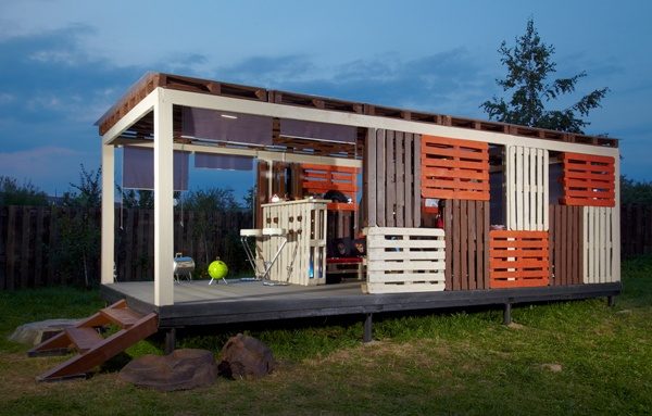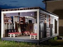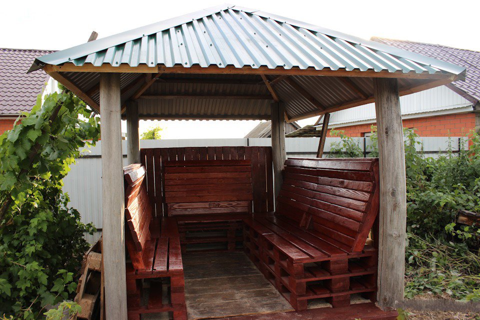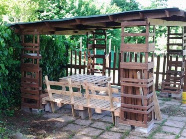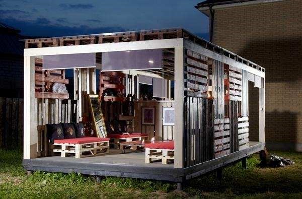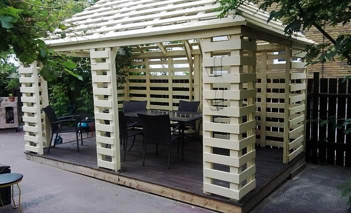 Aber es kommt auf das Budget an, und wenn es kein Geld gibt, um einen Pavillon aus klassischen Baumaterialien zu bauen, dann ist es möglich, alternative und sehr preiswerte Materialien, wie Holzpaletten, zu verwenden.