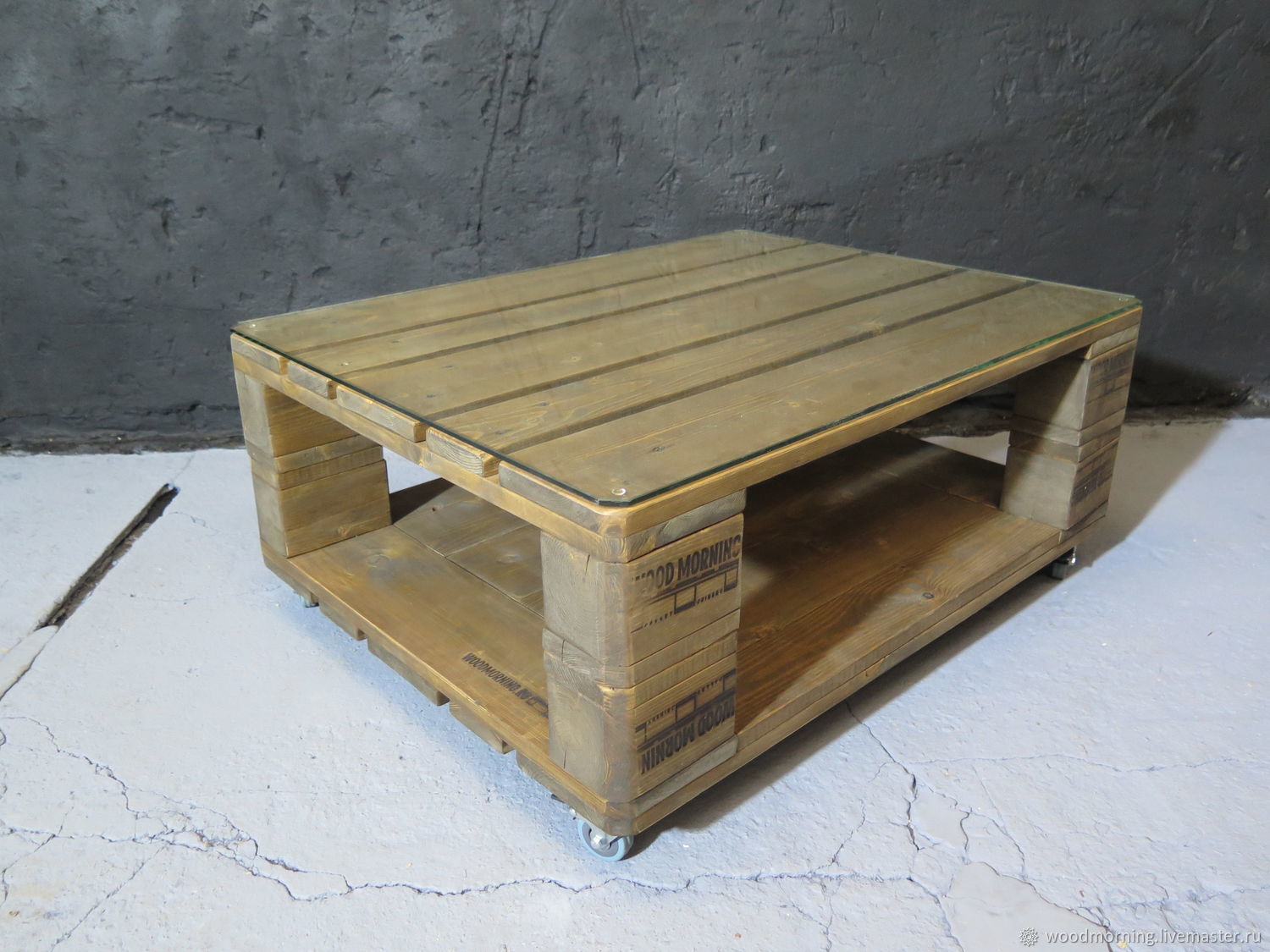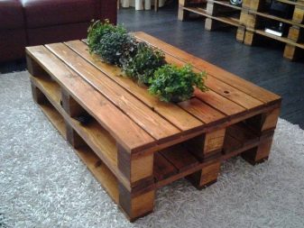 Einen Tisch zu machen ist sehr einfach. Eine Palette wird genommen, ihr oberer Teil muss vollständig mit Planken ummantelt werden, und an den Seiten, innen sind die Beine aus dicken, behandelten Brettern. Und anstatt Beine können Sie auch eine Tischplatte in der Mitte machen, dann können Sie die Tischplatte entfernen, die es einfacher macht, den Tisch zu tragen.
