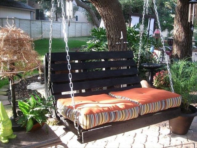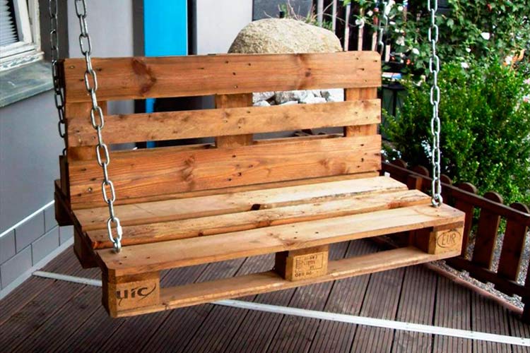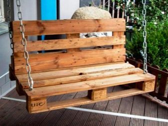 Sofa Swing zum Geben. Dies ist auch eine sehr einfache Konstruktion, die aus zwei oder vier Paletten besteht, die durch Umreifen aus einem 10 x 10 bar oder einer 40 mm dicken Platte zusammengebunden werden. Die Oberfläche ist ebenfalls mit glatten Platten bedeckt.