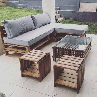 Natürlich können Sie Standardmöbel verwenden, die nicht mehr zu Hause benötigt werden, aber es besteht die Möglichkeit, die so genannten Gartenmöbel aus den gleichen Paletten zu machen. Sie machen schöne Tische, Bänke und sogar schicke Ecksofas, die Sie nur abdecken und die Kissen platzieren müssen.