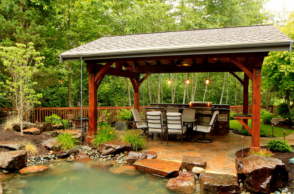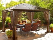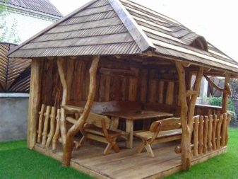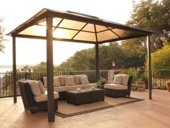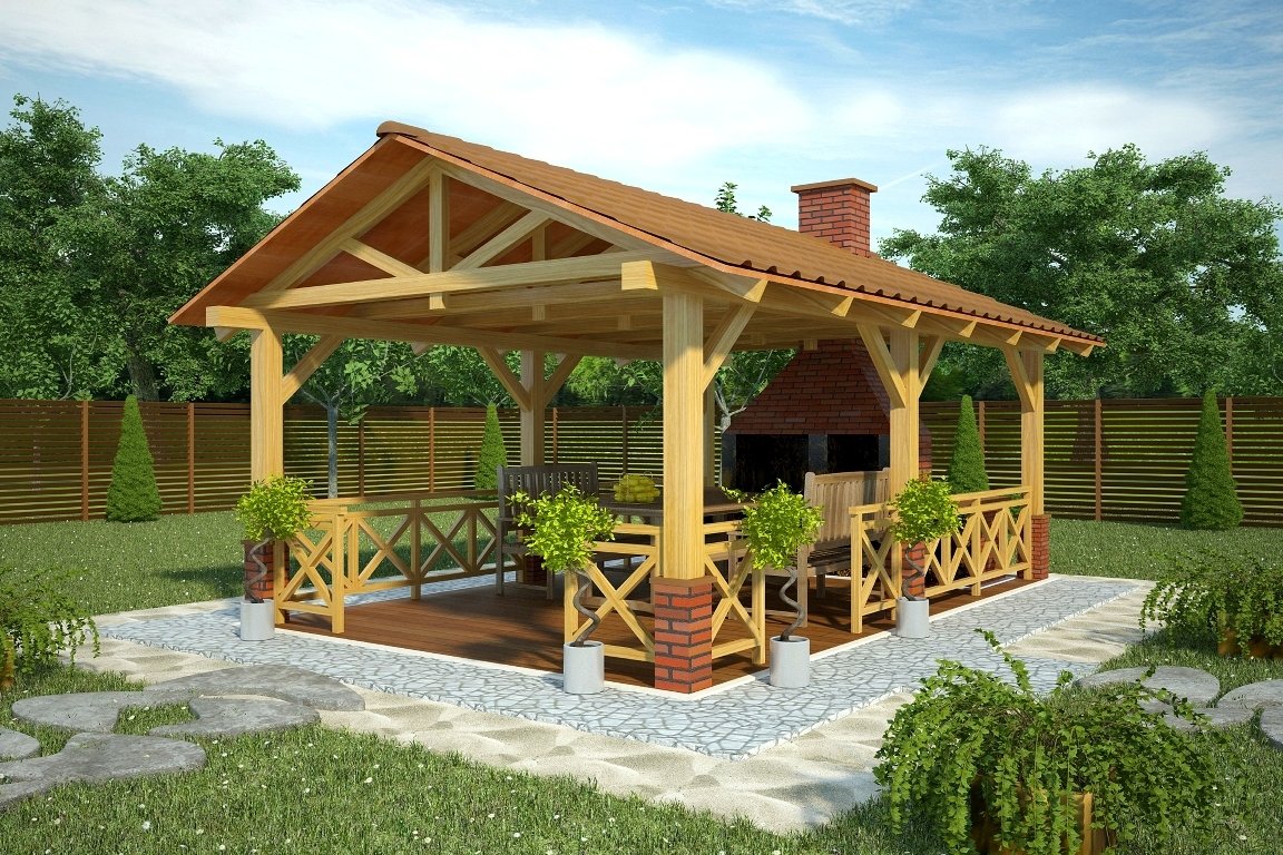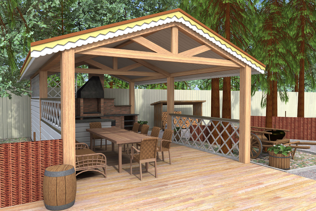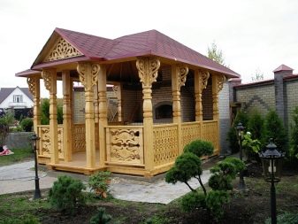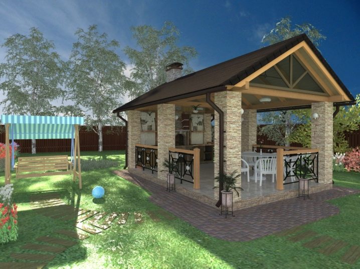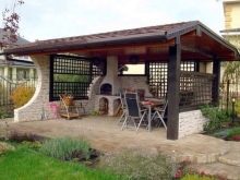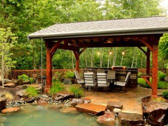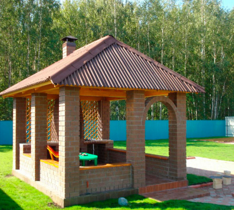 Für Sommerferien bei warmem Wetter brauchen Sie eine einfache Überdachung ohne Wände, Fenster und Türen. Zuverlässige Konstruktion mit Grill, Küche und Grill erfordert die Verwendung von Stein und Ziegel. Dieses Design bietet die Möglichkeit, sich zu jeder Jahreszeit bequem an Gäste und Familienmitglieder zu entspannen.