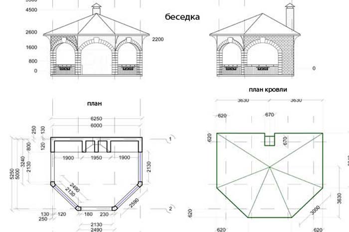Vor dem Beginn der Bauarbeiten ist es notwendig, ein genaues Projekt zu erstellen, das die Art des Materials, die Größe und die Form des Gartenpavillons, die Art des Daches und der Gründung beinhaltet.