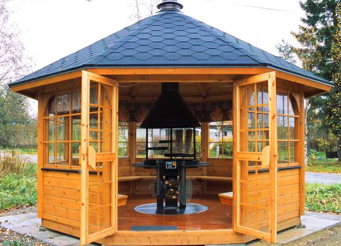 Vorteile - zuverlässiger Schutz vor Wind und Insekten. Nachteile - Entfernung des Erholungsgebietes von der umgebenden Natur, zusätzliche Installation des Schornsteins vom Kohlenbecken, professionelle Konstruktion von Zeichnungen.