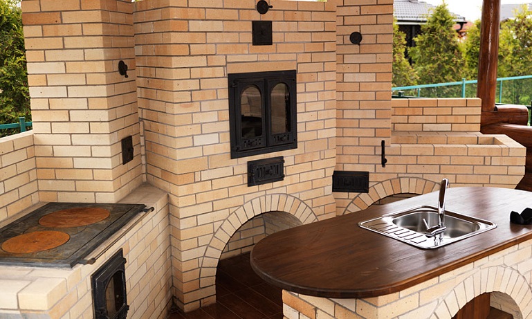 Eine separate Art von Sommerlaube ist ein Ziegelkomplex mit einem Ofen. Dieses Design ermöglicht es, nicht nur die Schönheit der Natur zu genießen, sondern auch kulinarische Meisterwerke aus Fleisch, Fisch und Gemüse zu kreieren. Pilaw, der auf dem offenen Feuer gemacht wird, ist ein exquisites Vergnügen für eine laute Gesellschaft und süßes Gebäck - eine Delikatesse für die jüngsten Gäste.