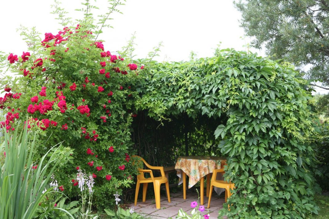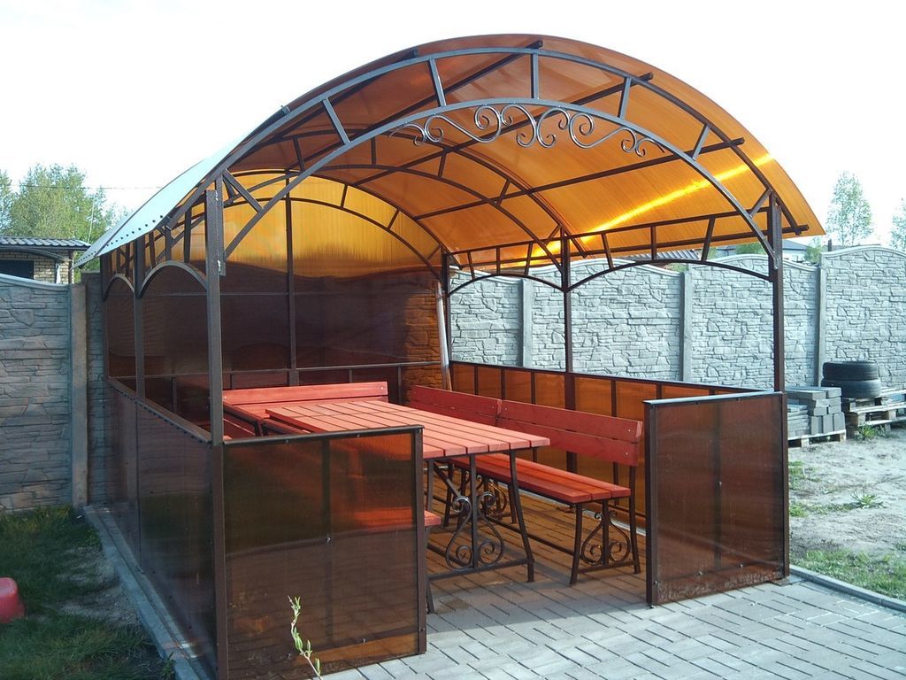 Preiswerte und moderne Art des Materials - Polycarbonat. Es wird verwendet, um die Wände und das Dach der Laube zu dekorieren. Polycarbonat ist ein zuverlässiger Schutz vor hellem Sonnenlicht und kaltem Sommerregen.
