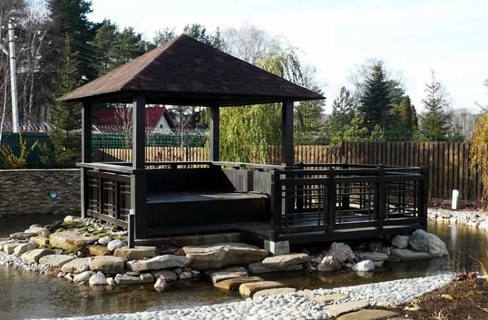 - Hüftdach Japanische Pavillons, Korbmöbel, Laternen und Papierdekorationen schaffen einen einzigartigen Geschmack des Ostens, füllen das Grundstück eines Landhauses mit japanischer Gastfreundschaft und schaffen eine Atmosphäre für Teezeremonien.