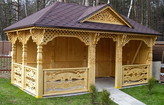 - Arbor, im russischen Stil mit geschnitzten dekorativen Elementen gemacht, wird ein einzigartiges Design auf einer Landseite werden, betonen den einzigartigen Stil der russischen Menschen, spiegeln ihre Kultur, Leben und Arbeit.