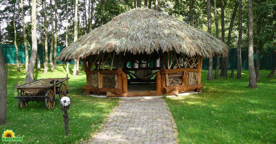 Der offene Blick auf den Pavillon wird für den Bau von Schuppen und Rotunden genutzt. Diese Struktur besteht aus Stützpfeilern und einem Dach, stört nicht den Aufstellungsort und ist ideal für die Platzierung in einem kleinen Bereich. Die Abwesenheit von Wänden wird es ermöglichen, die Struktur mit Luft zu füllen und harmonisch in die umgebende Natur zu integrieren.