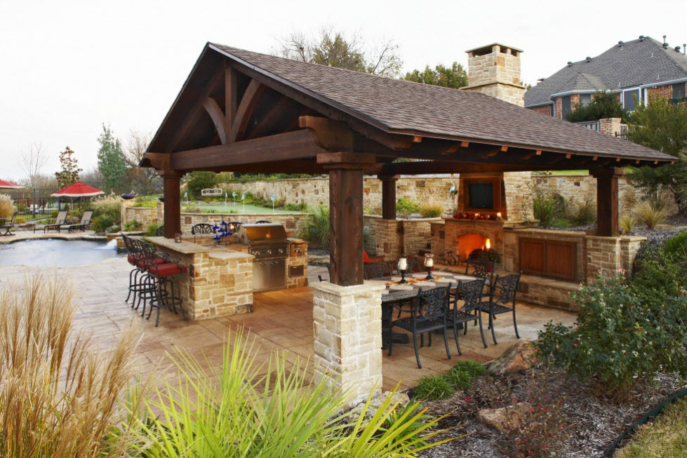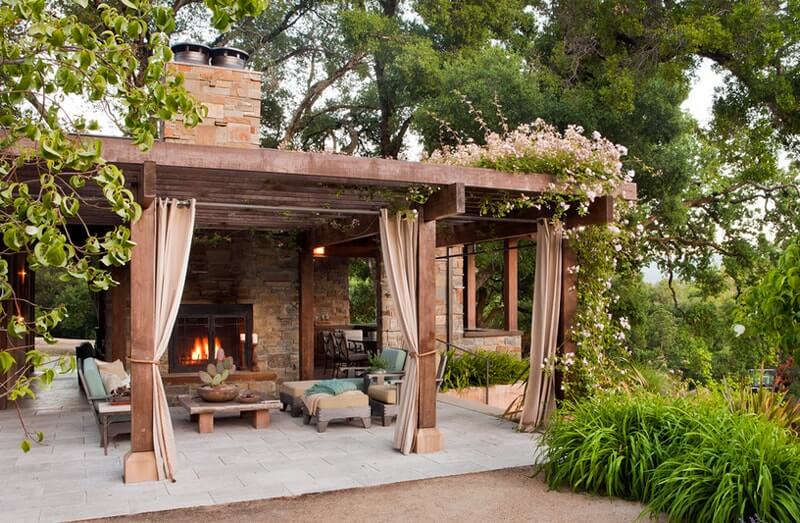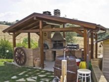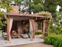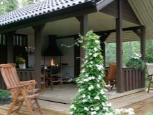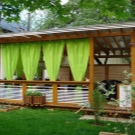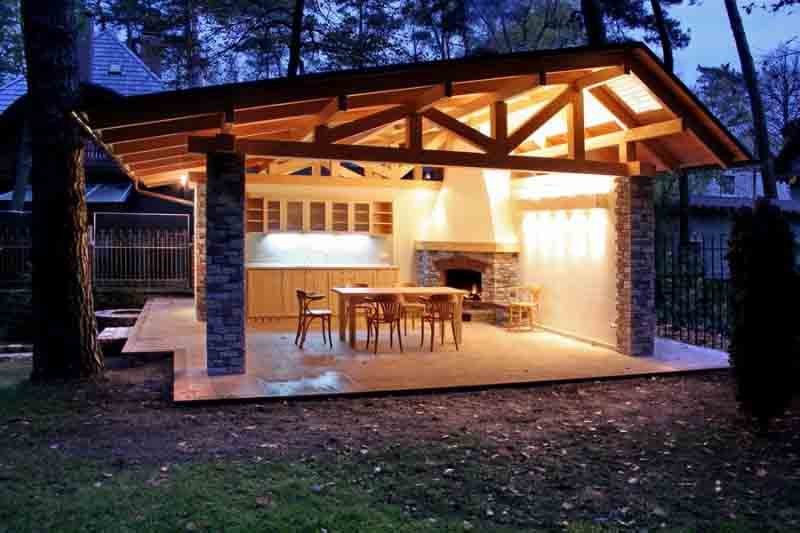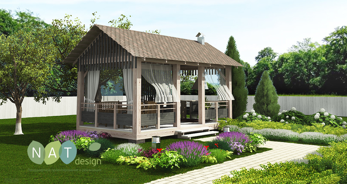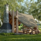 Es wird interessant sein, wie eine offene Laube mit einem Holzrahmen und einem großen Steinofen statt einer Rückwand aussehen. Frontale Holzstützen der Konstruktion sollten mit Lichtvorhängen ergänzt werden.