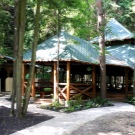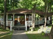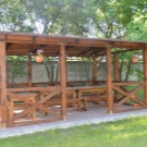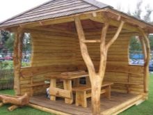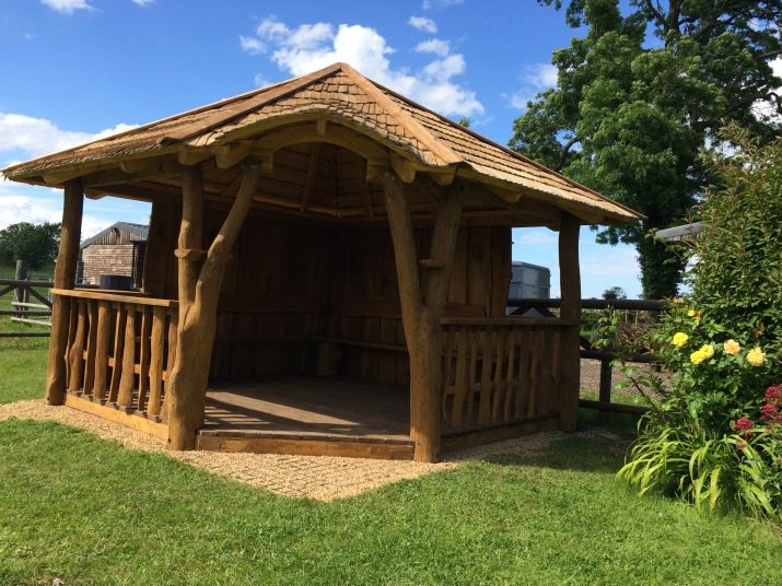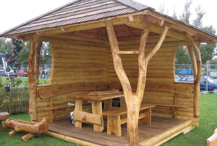 - Rustikal. In solchen Pavillons sollte ein natürliches Holz von schwacher Verarbeitung, aber mit einer glatten Oberfläche sein. Es ist notwendig, solche Konstruktionen mit volkstümlichen Details zu ergänzen, zum Beispiel mit einem Ofen anstelle eines Grills.