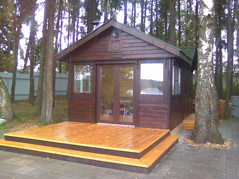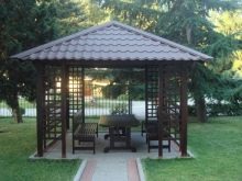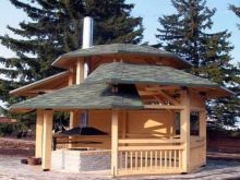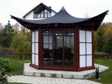 Diese Arten von Strukturen sind komfortabler und praktischer, da sie Wände an allen Seiten enthalten. Äußerlich ähneln diese Pavillons kompakten Häusern mit einer einfachen inneren Ausführung.