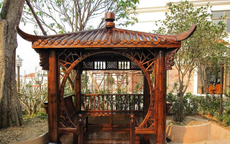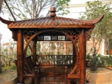 Ein luxuriöser Gartenpavillon im chinesischen Stil kann aus dunklem Holz, abgerundeten und geschnitzten kantigen Ausgängen, Holzgittern am oberen Teil der Wände und dem Dach, das gewölbt und auch in dunklem Holz geprägt sein kann, hergestellt werden.