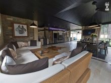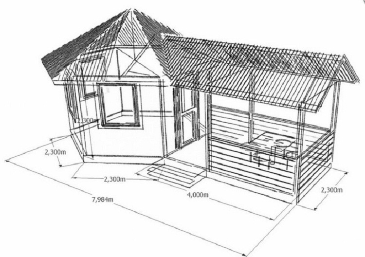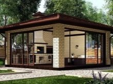 Interessanterweise wird auf dem Gelände eine Kombination aus glasverglasten Pavillons mit einer halbgeschlossenen Sommerküche aussehen. Gleichzeitig sollte die Küche mit einem Giebeldach verziert werden, und der Pavillon selbst sollte sechsseitig und mit einem entsprechenden Dach ergänzt werden. Der Eingang zu diesem Gebäude kann an der Kreuzung von Küche und Pavillons gemacht werden, während ein paar niedrige Stufen nach innen führen. Danach führt die Abzweigung nach rechts in die Sommerküche und nach links in das Resthaus.